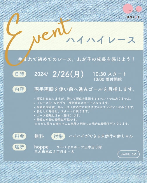 2024年2月26日(月)、コーベヤスポーツ三木店3階で「hoppeハイハイレース~Kobeya CUP!~」が開催されます。