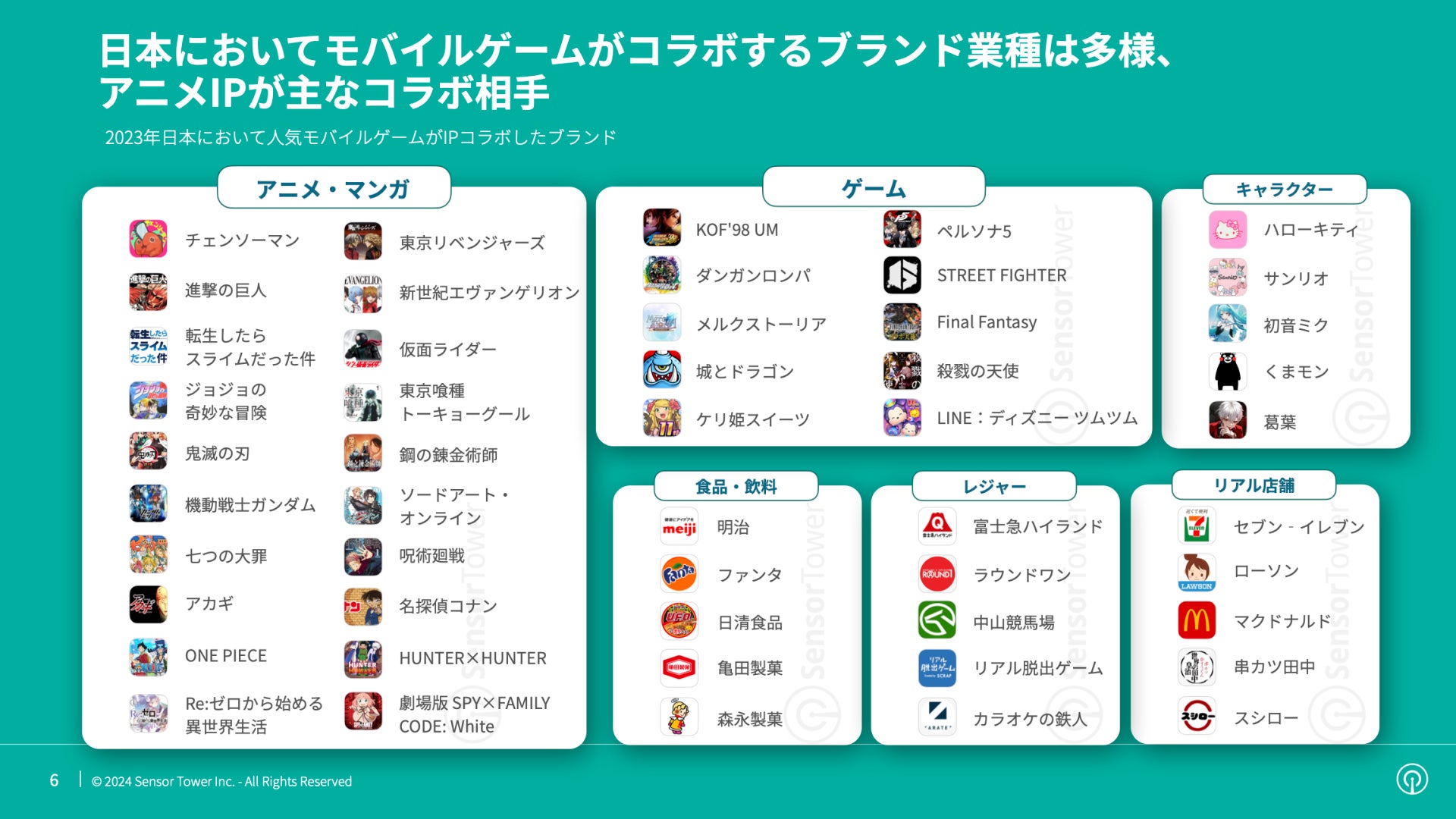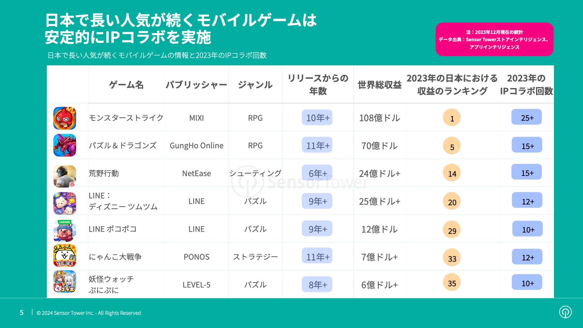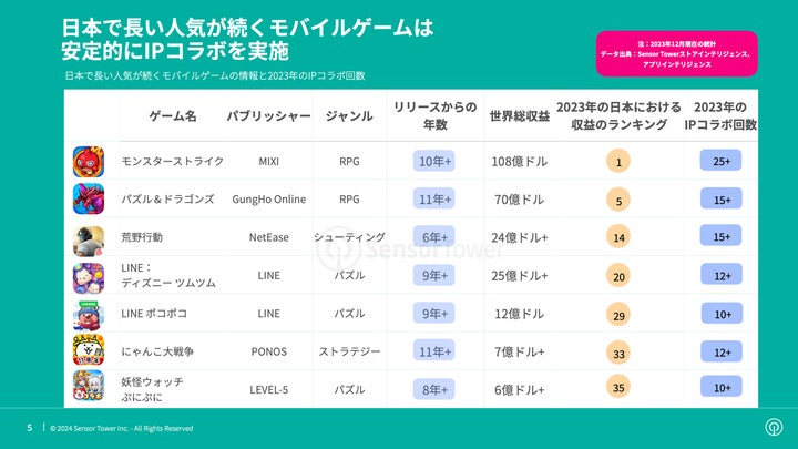 2023年の日本のモバイルゲーム市場では、IPコラボが盛んに行われており、『モンスターストライク』のIPコラボ回数は25回を超え、世界累計収益は108億ドルに達しています。