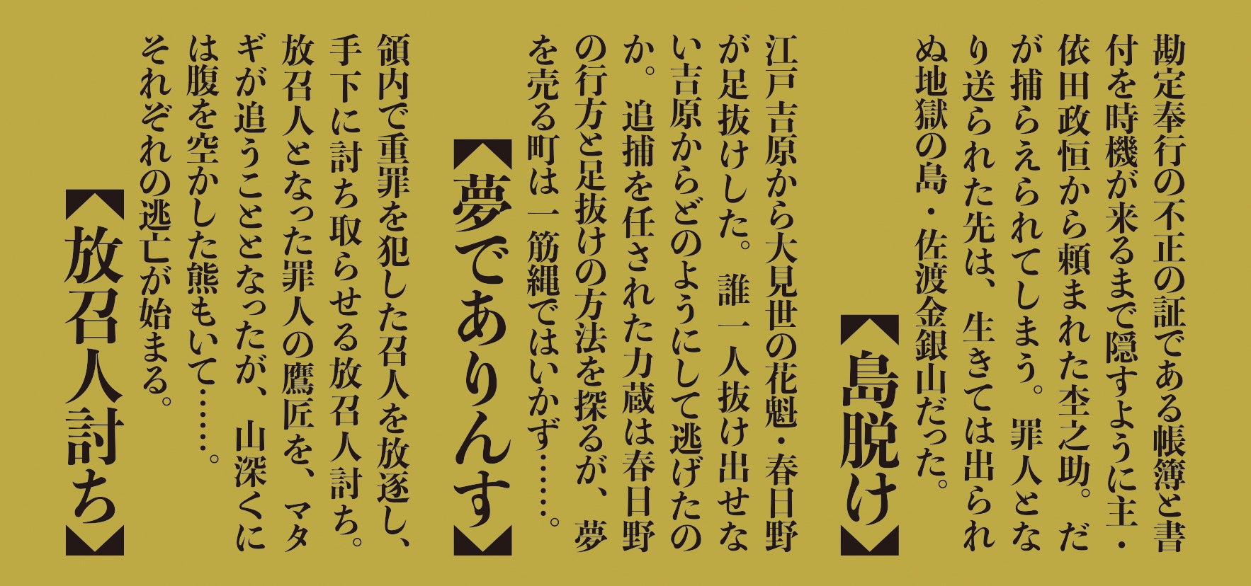 この作品は、脱出不可能な孤島や足抜け厳禁の遊廓、追手だらけの深山など、絶体絶命の窮地から罪人が逃げる物語です。