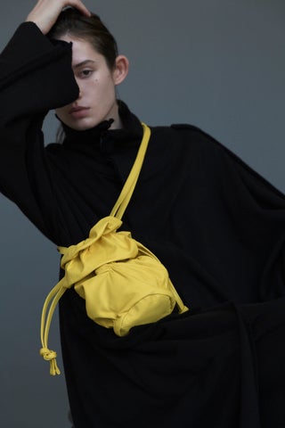 このコレクションは、Yohji Yamamotoのギャザードレスからインスピレーションを受けたパイナップルのようなデザインが特徴です。