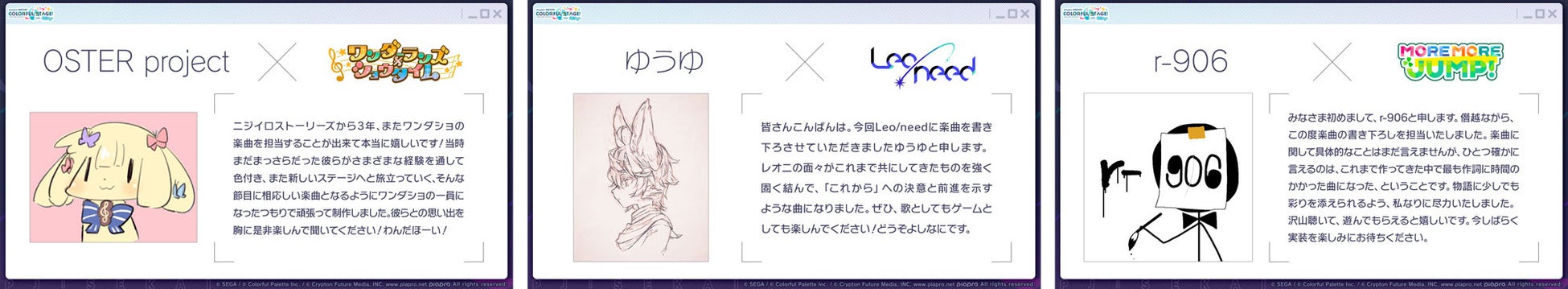 『プロジェクトセカイ』の新たな楽曲提供クリエイターとして、OSTER projectさん、ゆうゆさん、r-906さんが参加することが決まりました。