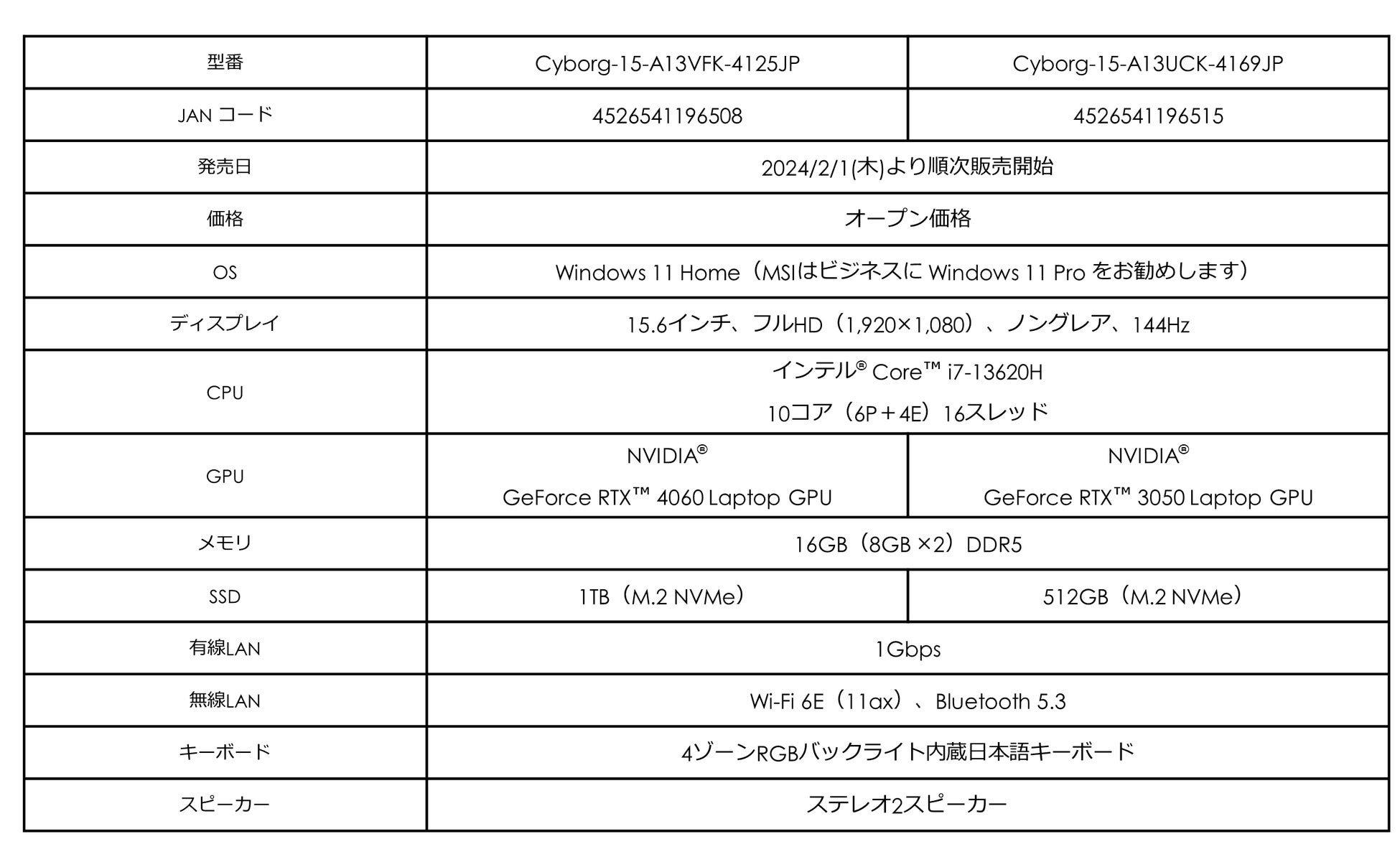 - 「Cyborg 15 A13V」は、ミドルスペックモデルでフルHD解像度高フレームレートのゲーミングに最適