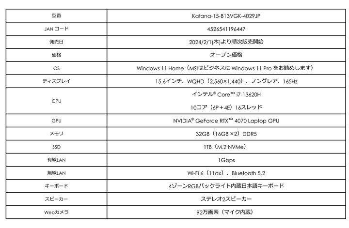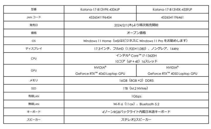 - 「Katana 15/17 B13V シリーズ」は、FPSやバトルロイヤルゲーム向けのハイスペックモデル