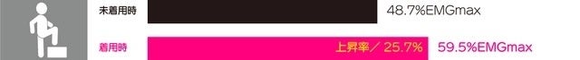 ②踏み台昇降運動(高さ35cm、60秒で3回)未着用時:48.7%EMGmax ⇒ 着用時:59.5%EMGmax 上昇率:25.70%