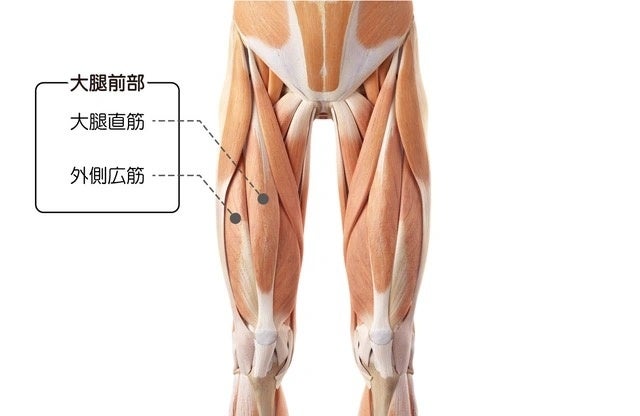 大腿前部は大腿直筋、外側広筋からなる大きな筋肉です。体全体の筋肉のうち、なんと約12%の筋肉量を占めています!
