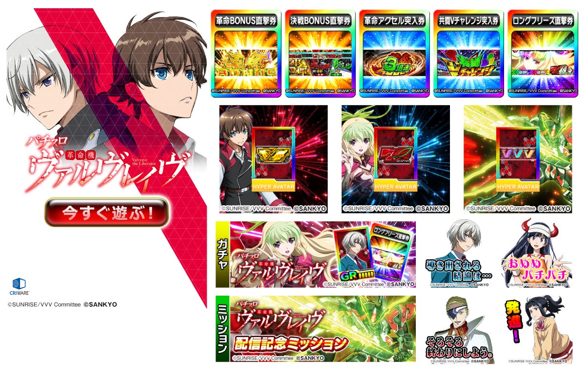 コムシード株式会社は、ソーシャルゲーム「グリパチ」において、株式会社SANKYO製の遊技機『パチスロ 革命機ヴァルヴレイヴ』のシミュレーターアプリを一般配信開始しました。