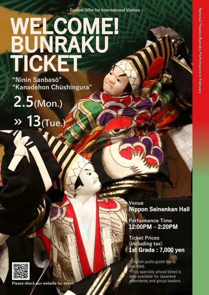 国立劇場主催の2月文楽公演では、外国人のお客様向けの特別プラン「WELCOME!BUNRAKU TICKET」をご用意しています。