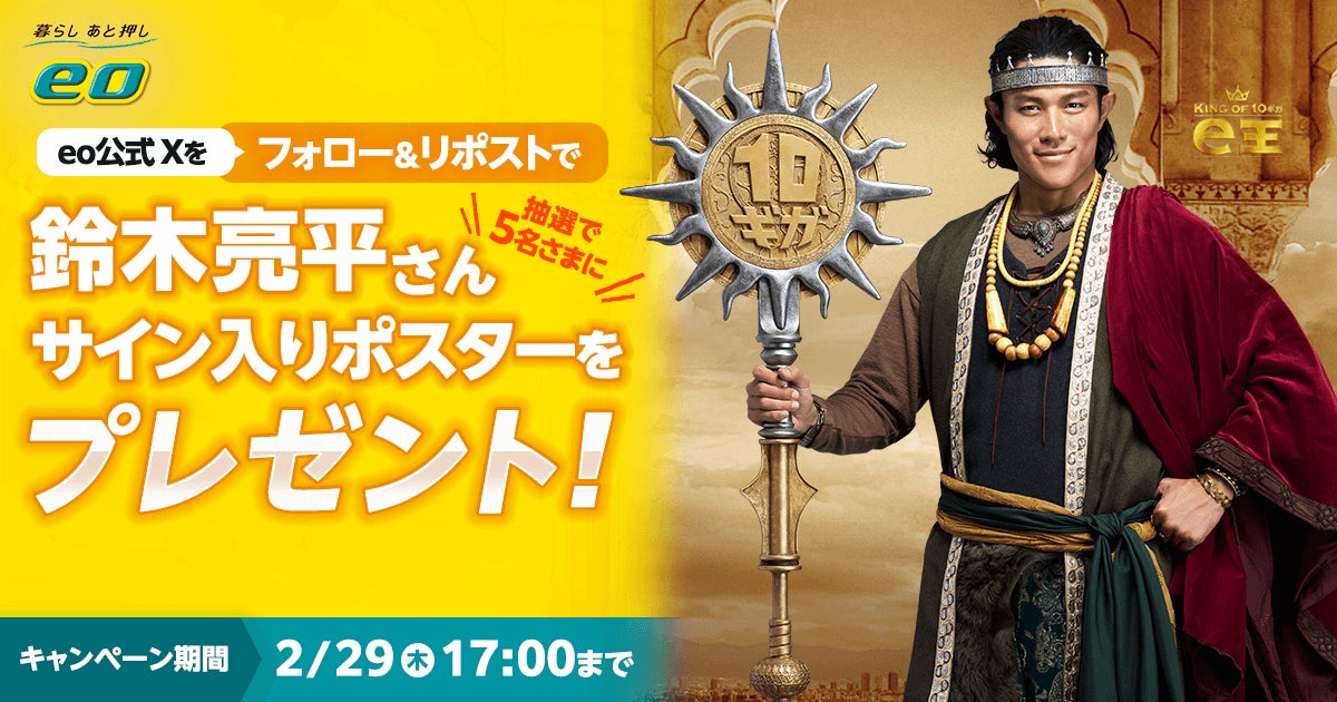 eoは、超高速FTTH市場をリードするために、イメージキャラクターの鈴木亮平さんを起用し、『KING OF 10ギガ e王』というキーメッセージで、お客様満足度や通信の安定性、10ギガ提供エリア、戸建てシェアなど、eoが選ばれる理由を力強い世界観で表現するテレビCMとWeb動画を放映します。