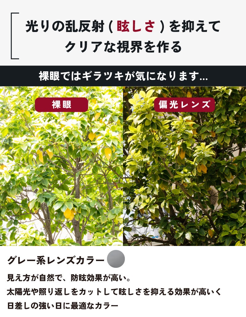 - 2. 偏光レンズで眩しさを抑え、目の疲れを防止。