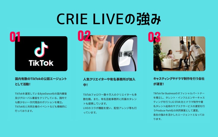- TikTok Liveの公認エージェント事業として、タレントインフルエンサーのキャスティングや番組制作、有名タレントの定額起用サービスを提供