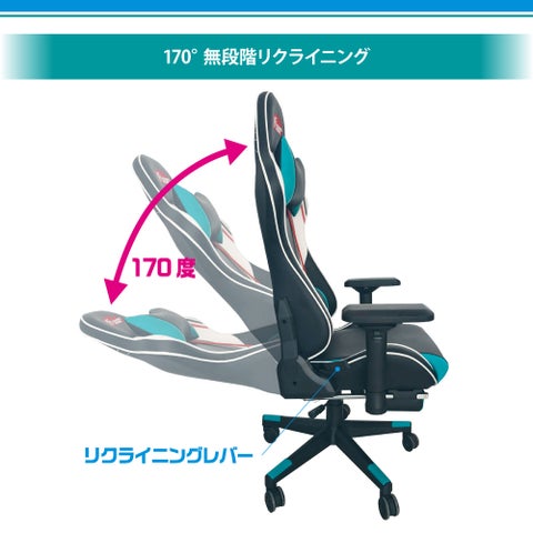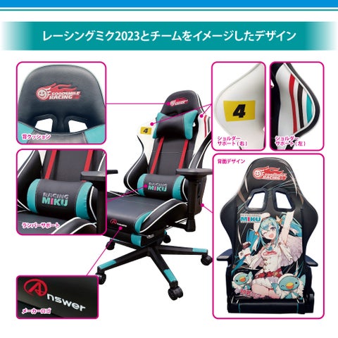 このゲーミングチェアは、クリーンでスポーティなマシンカラーリングのデザインで、背面には「レーシングミク2023 Ver.」のイラストが大きく掲載されています。