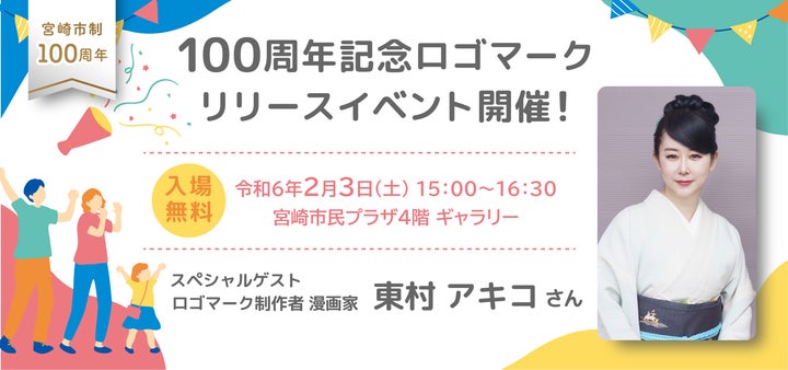 漫画家の東村アキコさんと共に、100周年記念ロゴマークの誕生をお祝いしましょう!日時は令和6年2月3日(土)15:00~16:30で、場所は宮崎市民プラザ4階ギャラリーです。