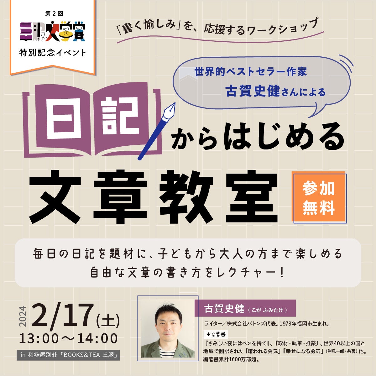 【第2回三服文学賞イベント】古賀史健さんによる「日記からはじめる文章教室」を2月17日(土)に開催!