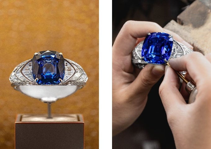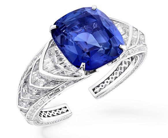 特に注目されたアイテムは、118カラットの非加熱スリランカ産クッションカットサファイアを使用したバングルで、39カラットを超えるダイヤモンドがセットされ、壮麗な輝きを放っています。