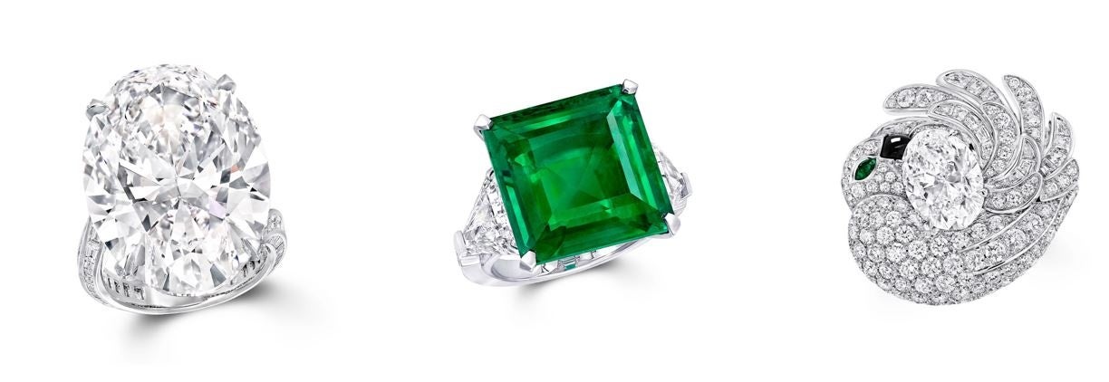 また、ロゼンジシェイプ&エメラルドカットのエメラルドとダイヤモンドを使用したネックレスや、オーバルシェイプダイヤモンドを抱く鳥のリングなども人気を集めました。