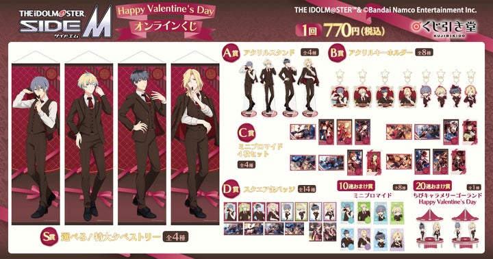 また、アイドルマスター SideM Happy Valentine’s Dayオンラインくじでは、特大タペストリーやアクリルスタンド、アクリルキーホルダー、ミニブロマイドなどが当たります。