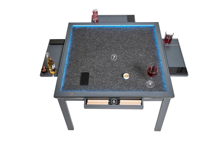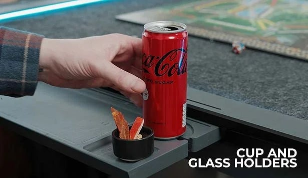 このテーブルにはセンサー照明やワイヤレス充電、カップ&グラスホルダー、ワンタッチプレーヤーデスク、カードスロット、アイテム収納引き出しなどの機能があります。