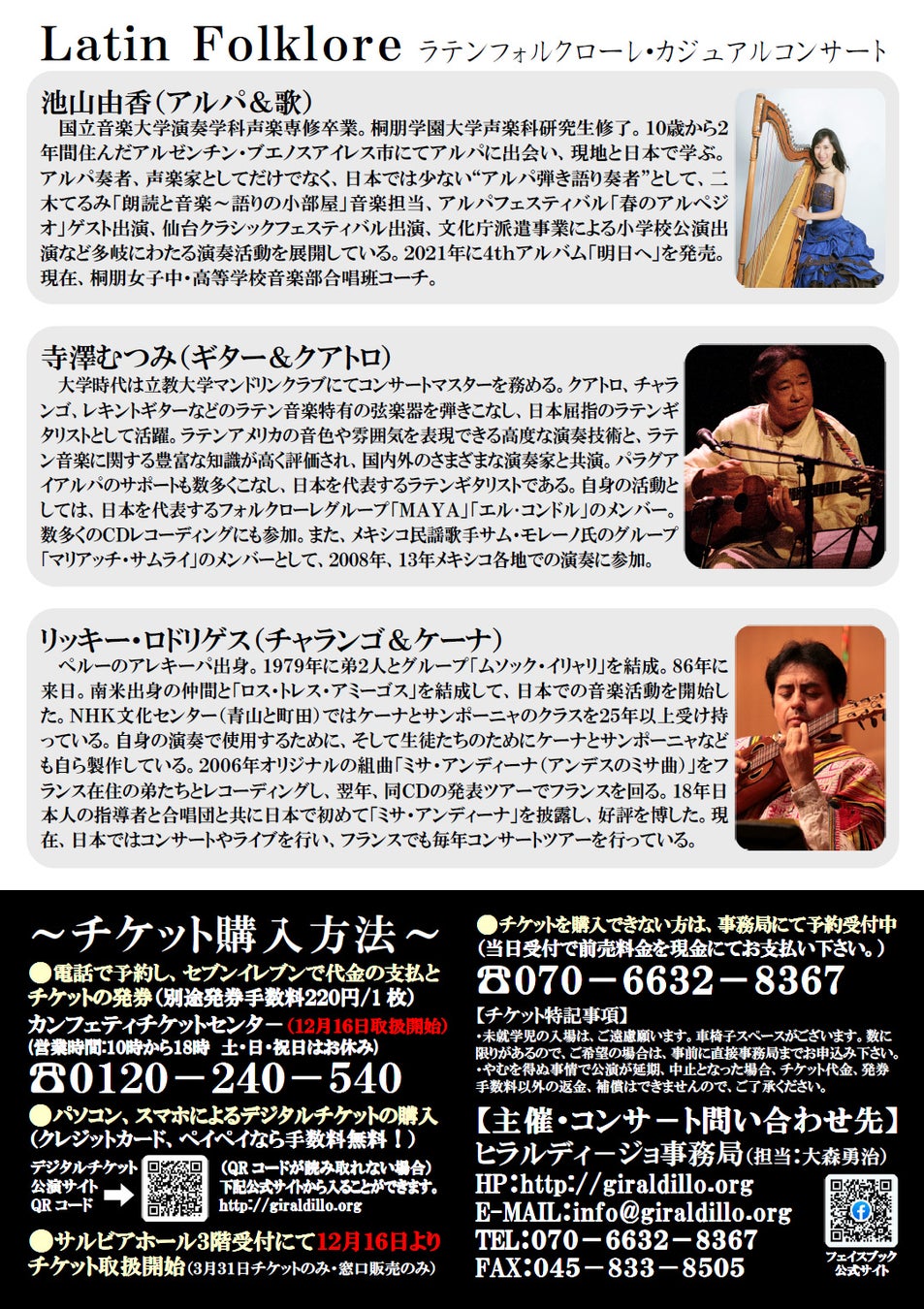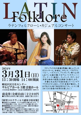 2024年3月31日(日)に横浜市鶴見区民文化センターのサルビアホールで開催される「ラテンフォルクローレ・カジュアルコンサート」のチケットが発売中です。