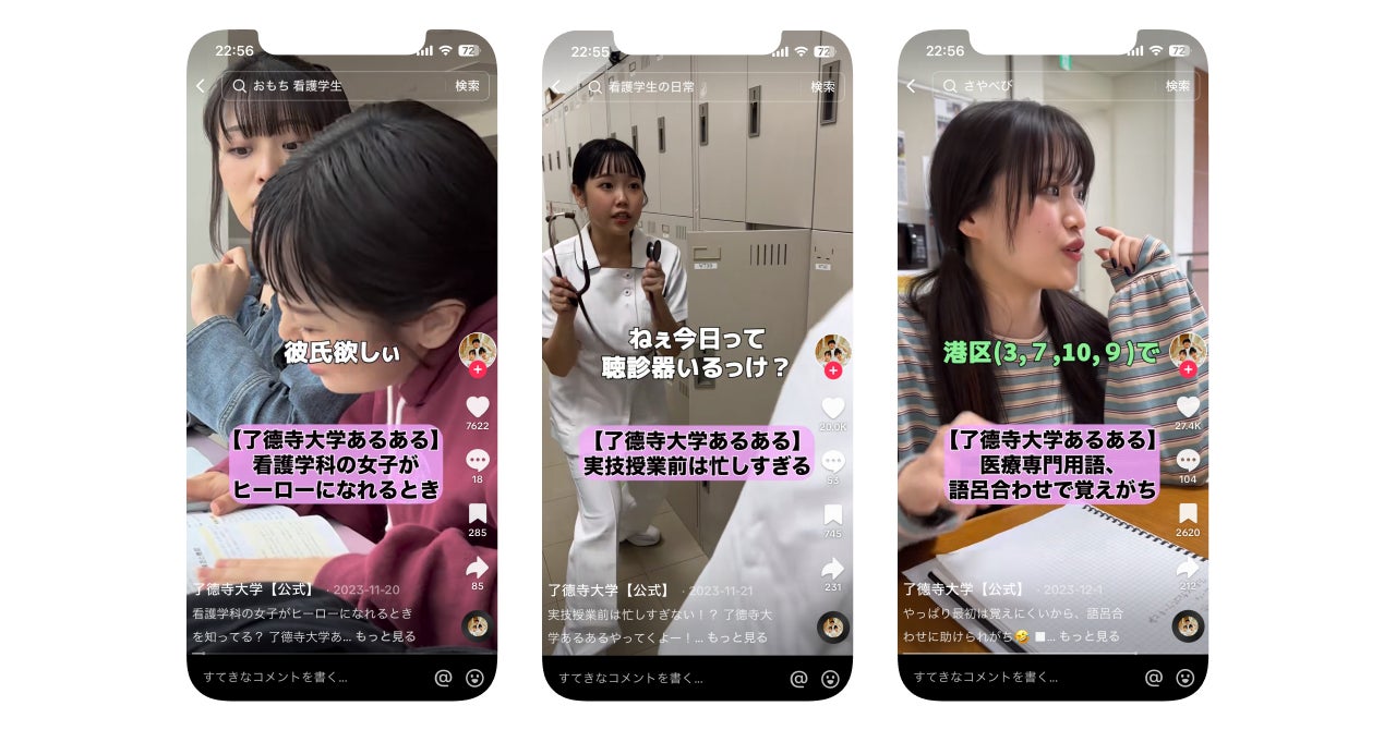 了德寺大学のTikTokアカウントでは、在学生からの「了德寺大学あるある」をテーマにしたショートドラマを制作し、多くの共感を得ました。