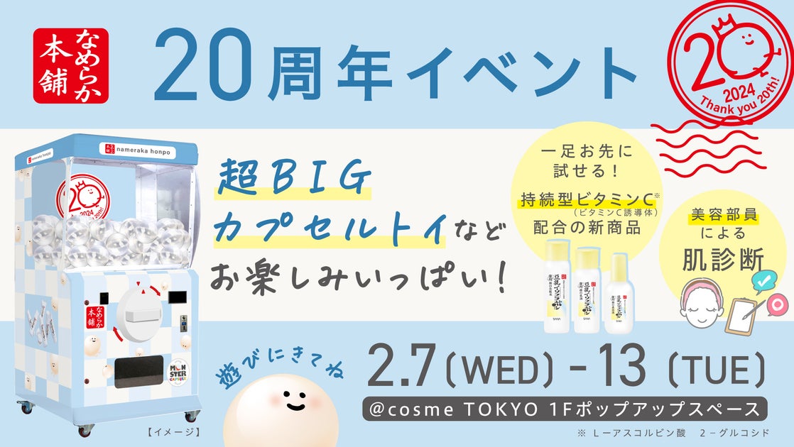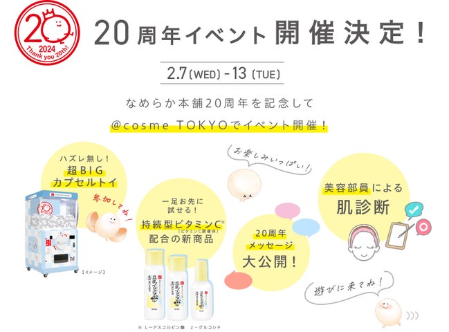 なめらか本舗は、2024年2月7日から13日まで、@cosme TOKYOでなめらか本舗20周年イベントを開催します。