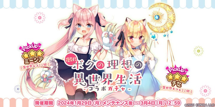 また、同時に「ボクの理想の異世界生活コラボガチャ」も開催され、異世界のケモ耳娘たちを手に入れることができます。