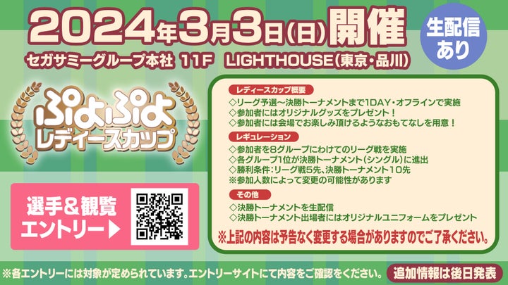 また、セガ公式「第3回 ぷよぷよレディースカップ」のエントリー受付も開始されていますので、興味のある方はぜひ参加してください。