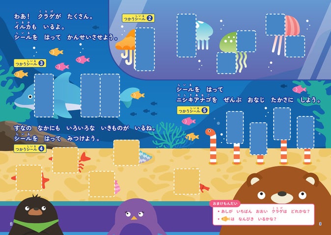 シールブックでは、アプリ内の知育パズルを再現し、シールを使って問題を解くことができます。