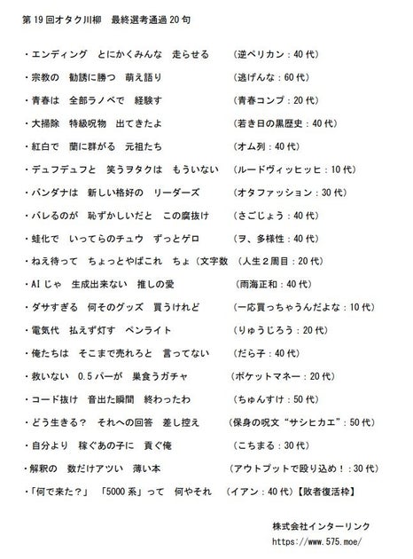 - 第19回オタク川柳大賞の投票を開始、テーマは「原点回帰」