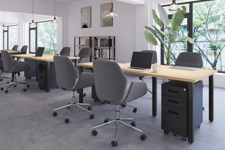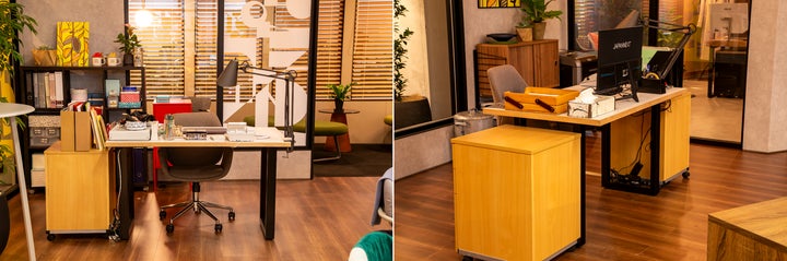 - KANADEMONOの強みである「3000通りを超える天板と脚の組み合わせ」を活用し、各セクションで素材カラーサイズが異なるデスクが設置されている