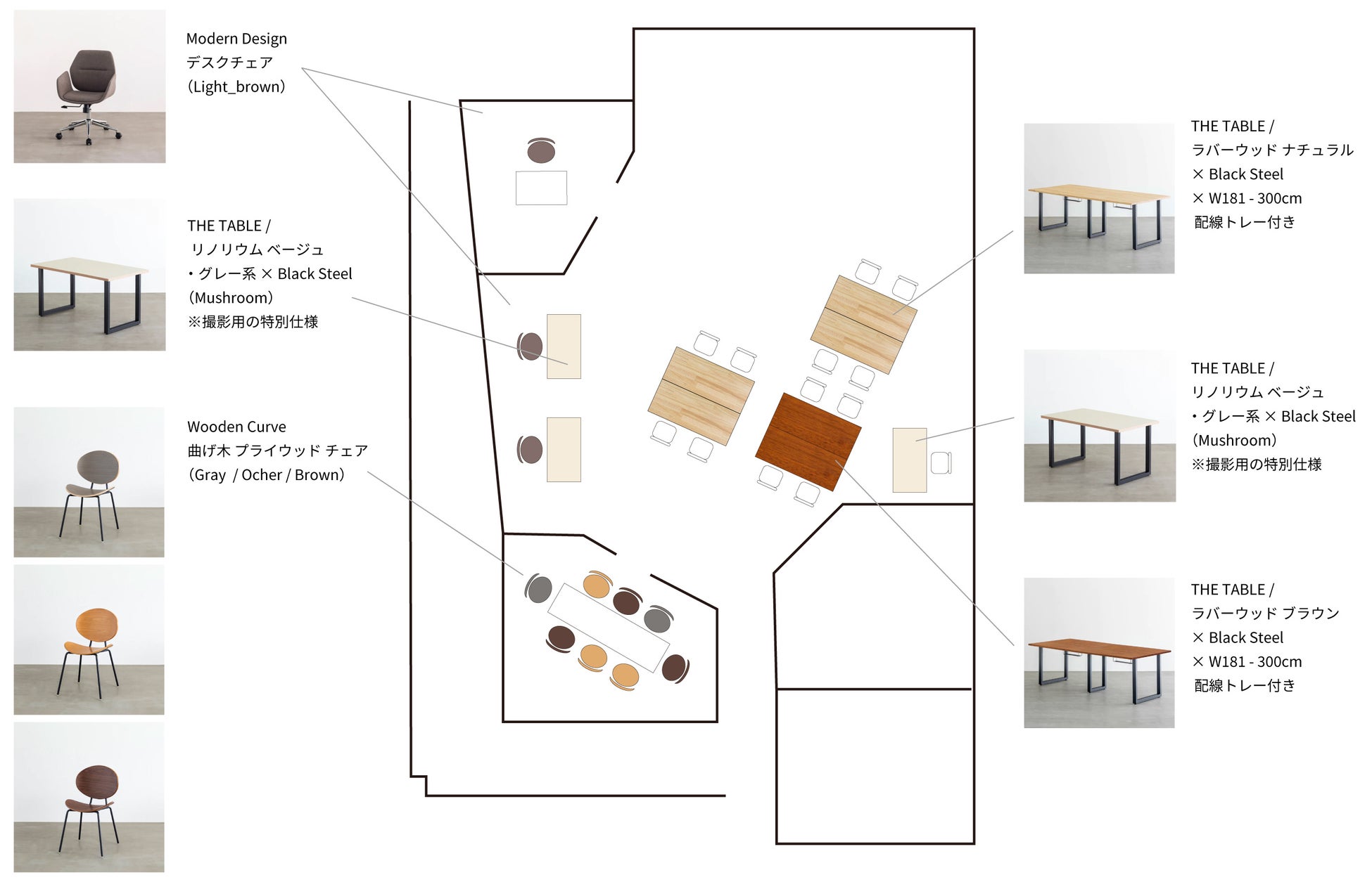 KANADEMONOの強みである「3000通りを超える天板と脚の組み合わせ」を活用し、各セクションには素材・カラー・サイズが異なるデスクが設置されています。