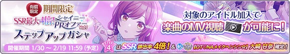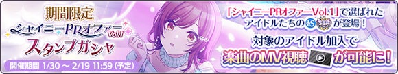 また、新曲のMVを視聴するために「シャイニーPRオファーVol.1スタンプガシャ」や「シャイニーPRオファーVol.1ステップアップガシャ」が開催されています。