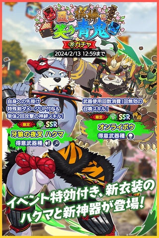 また、期間限定の「豆と棍棒と笑う青鬼」ガチャではSSR魂友「牙狼の夜叉 ハクマ」とSSR神器「オンライボウ」も入手可能です。