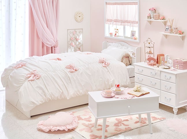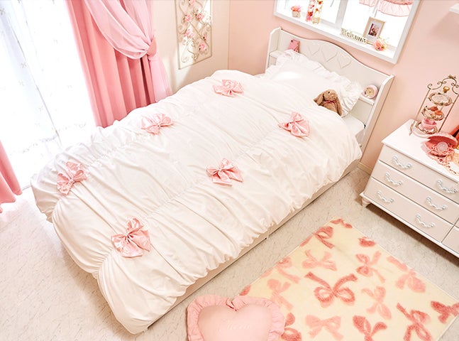 - 商品の概要は、ギャザーリボン付き布団カバー3点セット、ハートプリンセス収納ベッド(シングル)、フレンチリボンカーテンなど