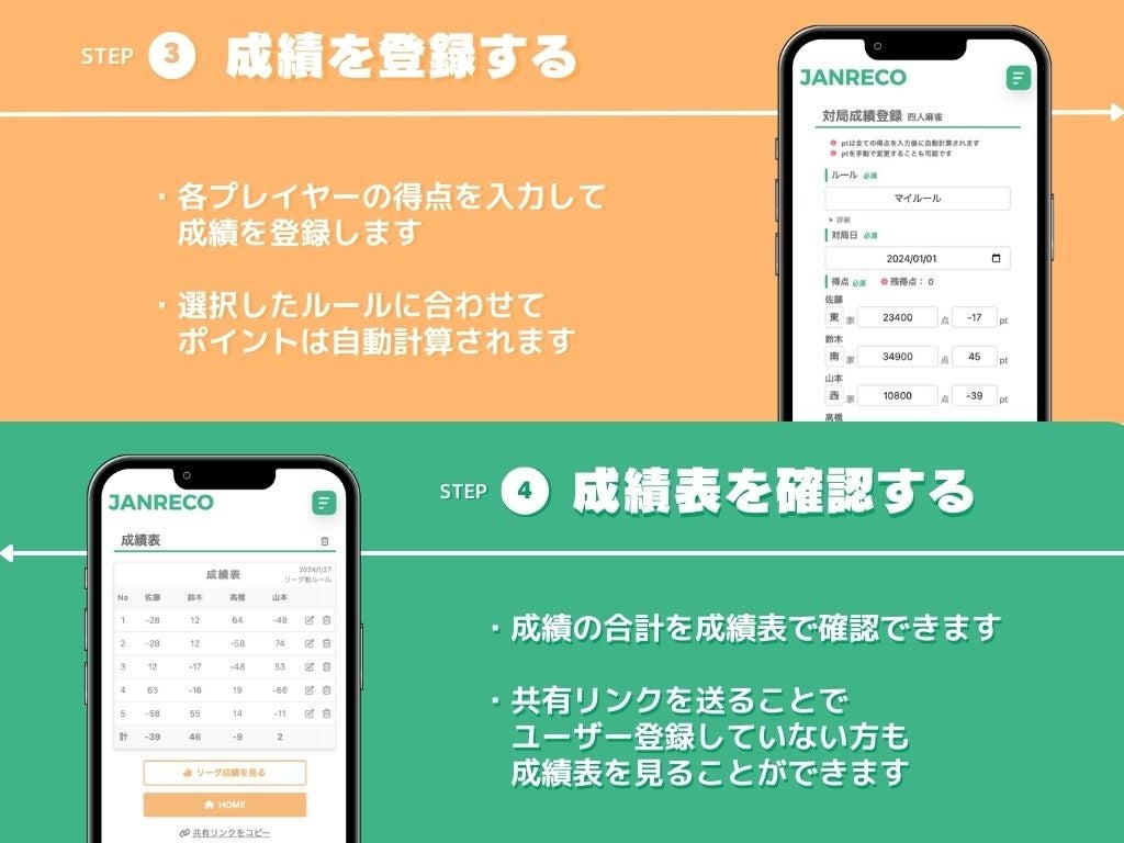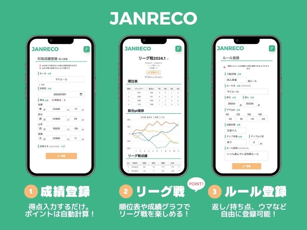 Janrecoはポイント自動計算機能やカスタマイズ可能なルール設定など、使いやすさと多様な遊び方に対応しています。