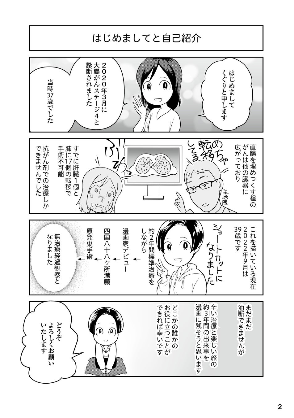 • 37歳の主人公が大腸がんステージ4と判明し、抗がん剤治療を受けながら旅をしつつ漫画家デビューを果たす