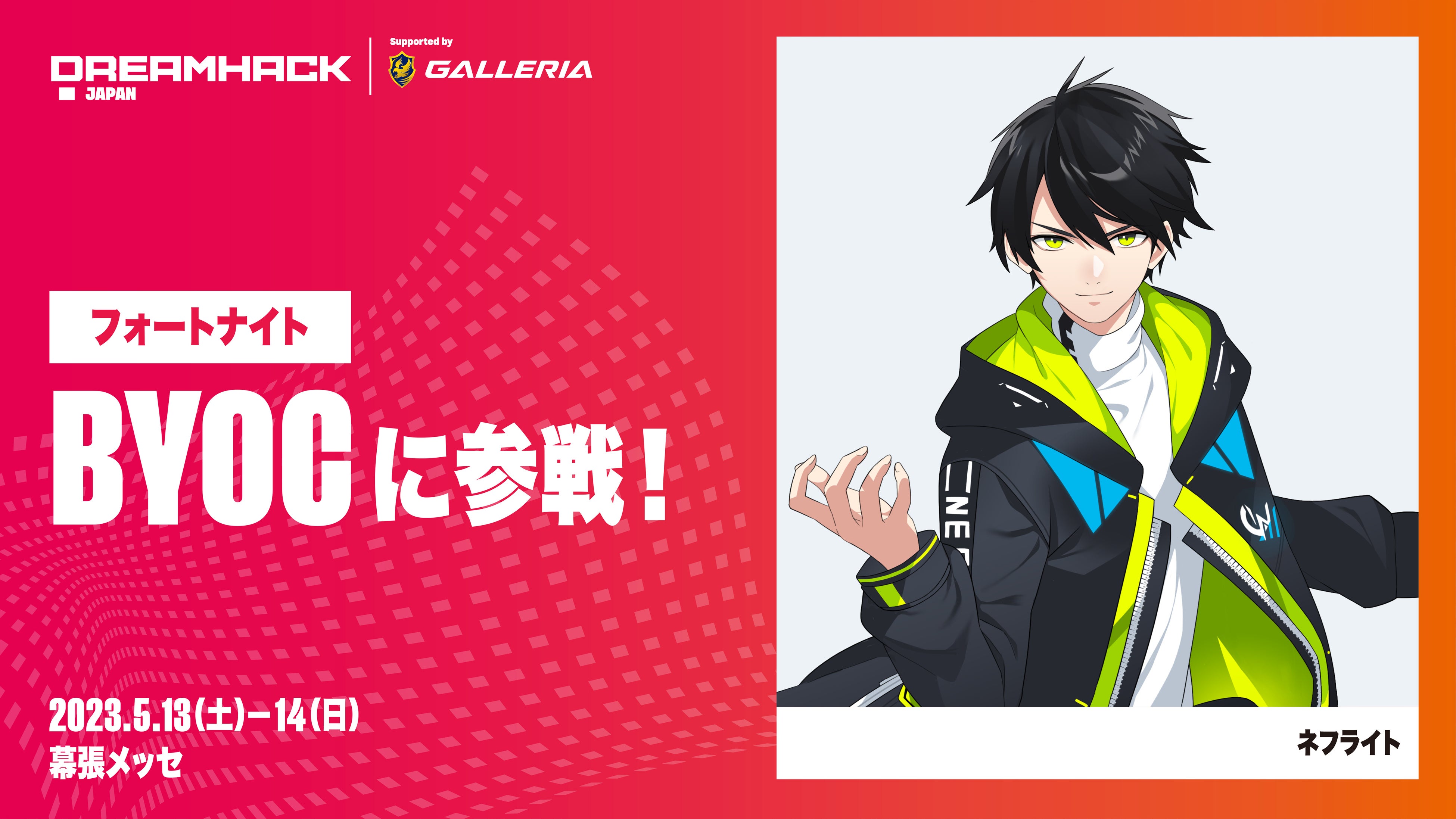 Activity Area内のBYOCエリアに、5月13日・14日の両日、元プロeスポーツ選手でYouTuberとしても大人気の「ネフライト」が参戦します!BYOCエリアでネフライトと一緒に、フォートナイトを満喫しましょう!