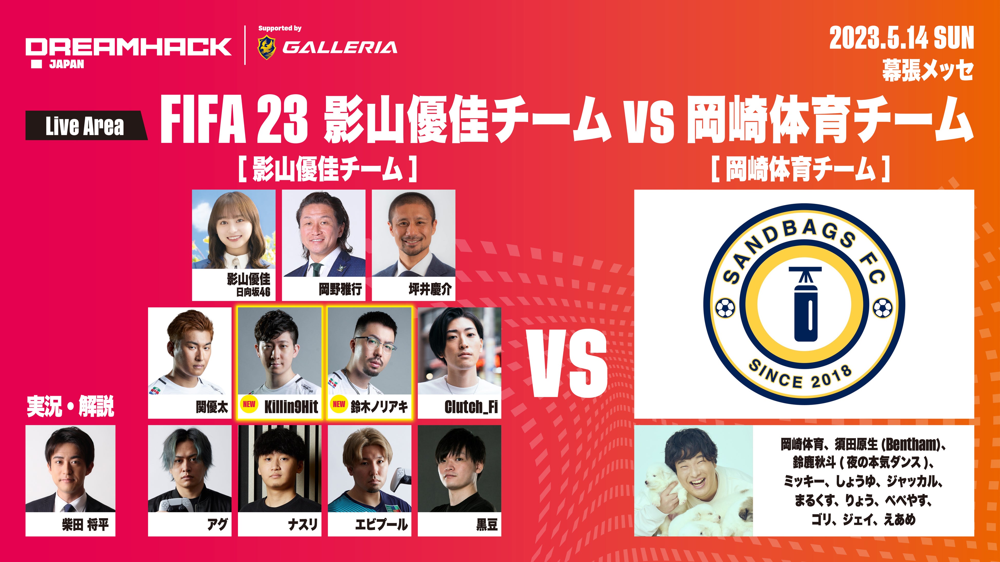 5月14日に開催予定のEA SPORTS FIFA23「影山優佳チームvs岡崎体育チーム」に、Killin9Hit、鈴木ノリアキの2名の出演が決定!岡崎体育率いるプロクラブチームに挑む「影山優佳チーム」の一員として、チームを勝利に導きます!
