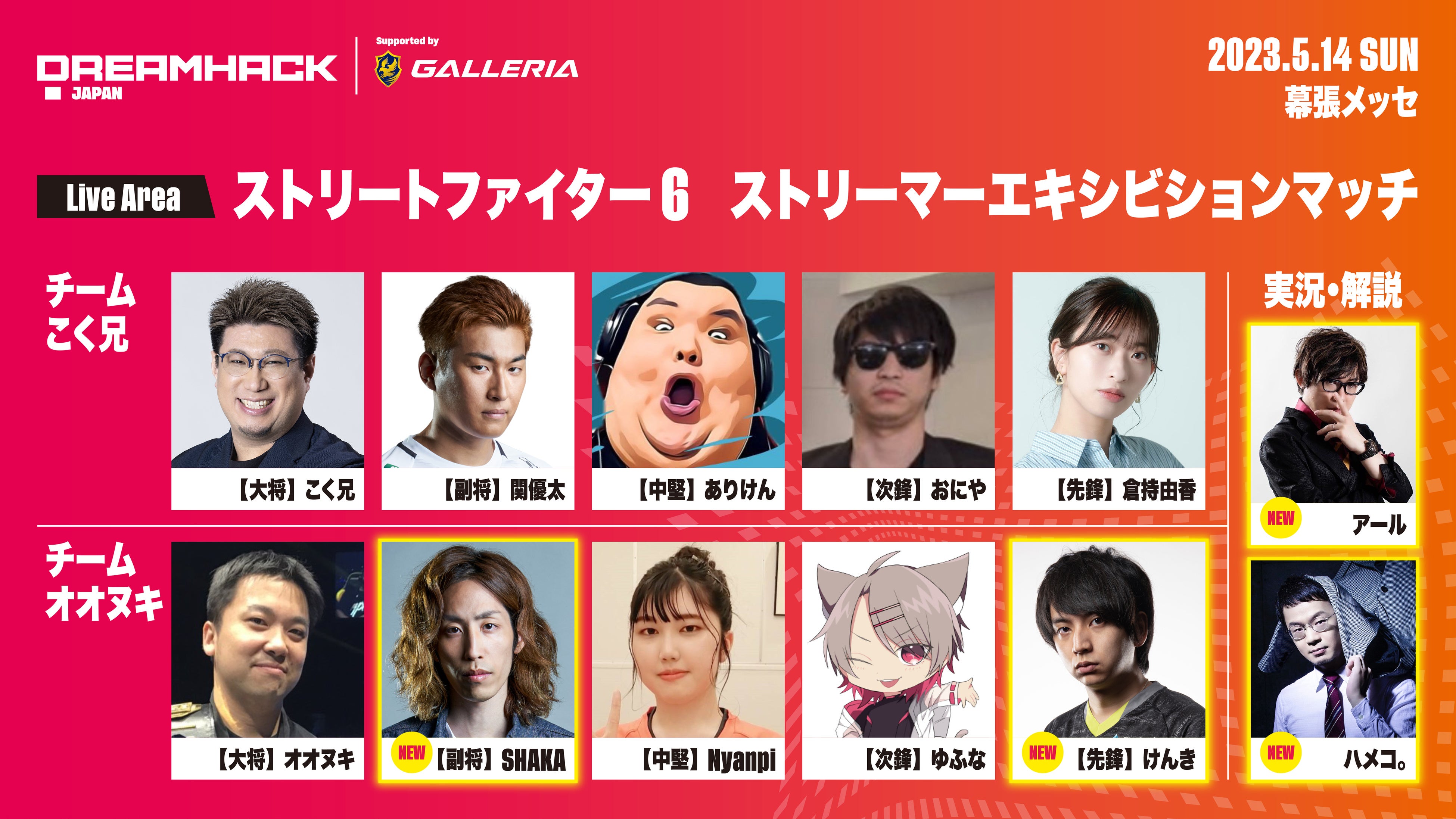 5月14日に開催予定のストリートファイター6「ストリーマーエキシビションマッチ」 の選手としてSHAKA、けんきの2名の出演が決定!さらに、実況・解説には、アール、ハメコ。の出演も決定しました。
