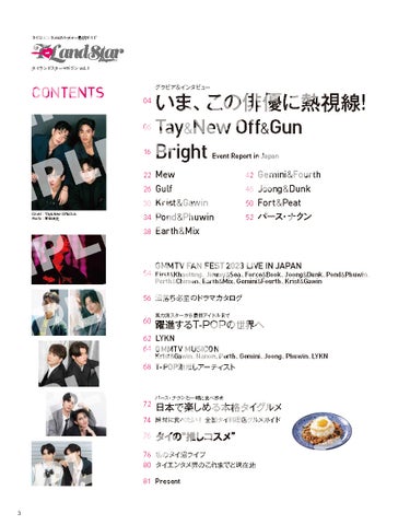 表紙には人気タイ俳優のTay&NewとOff&Gunが登場し、巻頭企画では彼らの撮りおろしグラビア&インタビューが掲載されています。