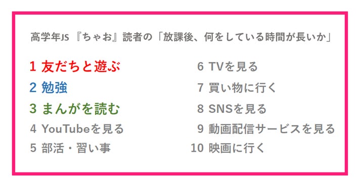 - 放課後の時間の使い方のアンケートでは、「友だちと遊ぶ」が1位