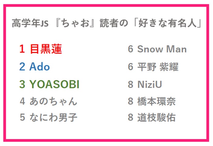 - 好きな有名人のアンケートでは、「目黒蓮」さんが1位
