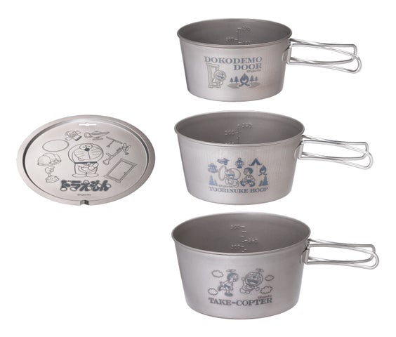 チタンシェラカップ4点セットは、食器としても調理器具としても使える万能アイテムで、ドラえもんのイラストが施されています。