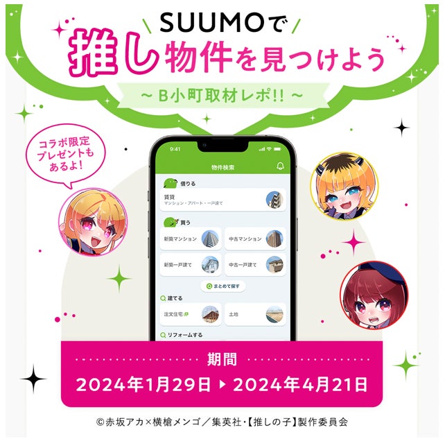2024年1月29日(月)から、株式会社リクルートが運営する不動産・住宅情報サイト『SUUMO』がTVアニメ『【推しの子】』と初のコラボレーションを開始します。