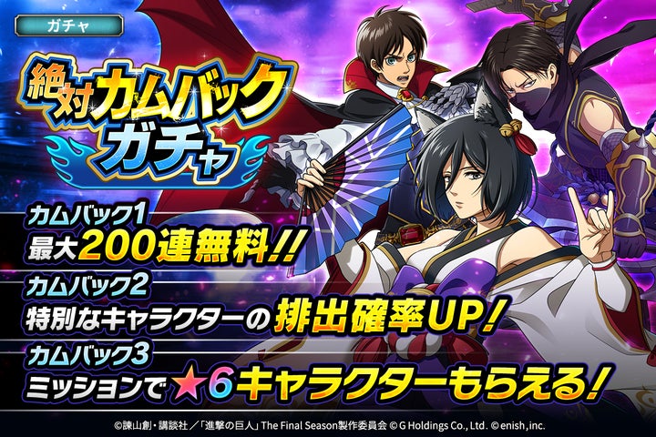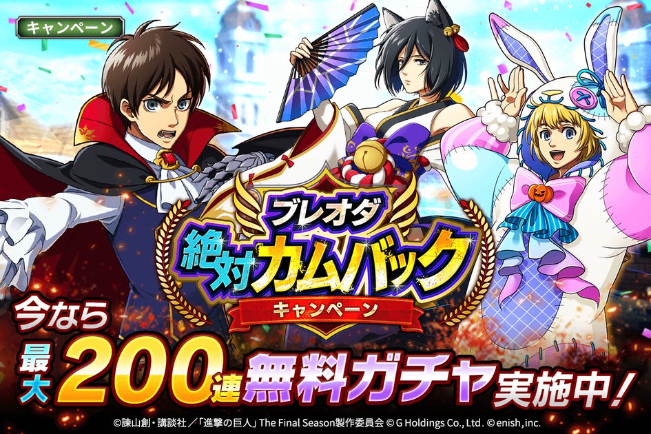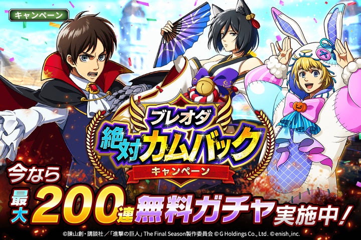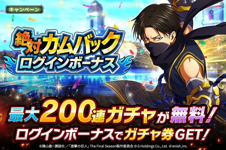 「進撃の巨人Brave Order」絶対カムバックキャンペーン!最大200連ガチャ無料!