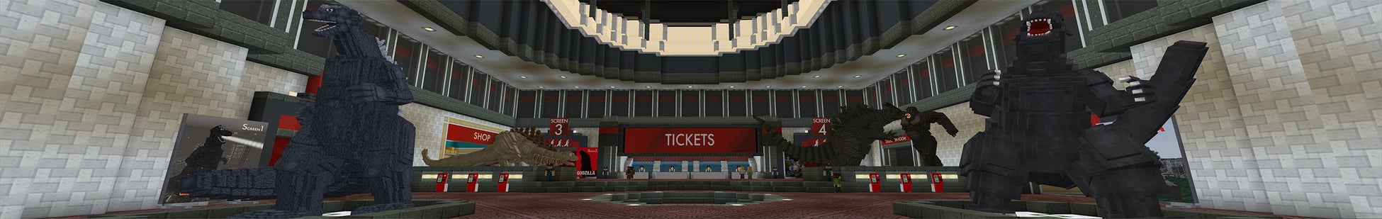 本作品はゴジラの世界観を再現したシネマコンプレックスをモチーフにしており、4つの作品のスクリーンが用意されています。