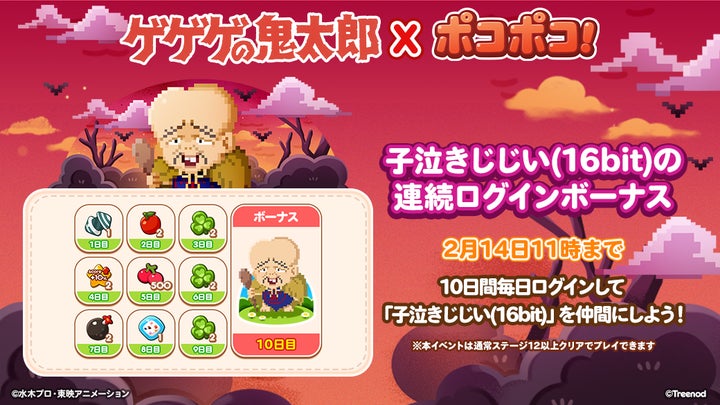 イベントは2024年1月31日から2月14日まで行われ、コラボ限定仲間として「鬼太郎(16bit)」や「目玉おやじ(16bit)」などが登場します。
