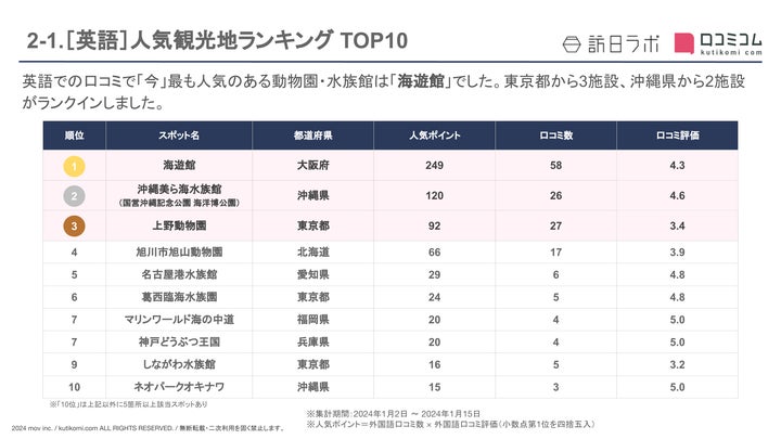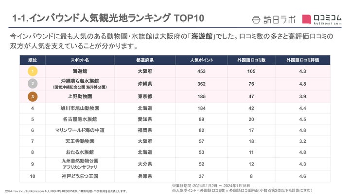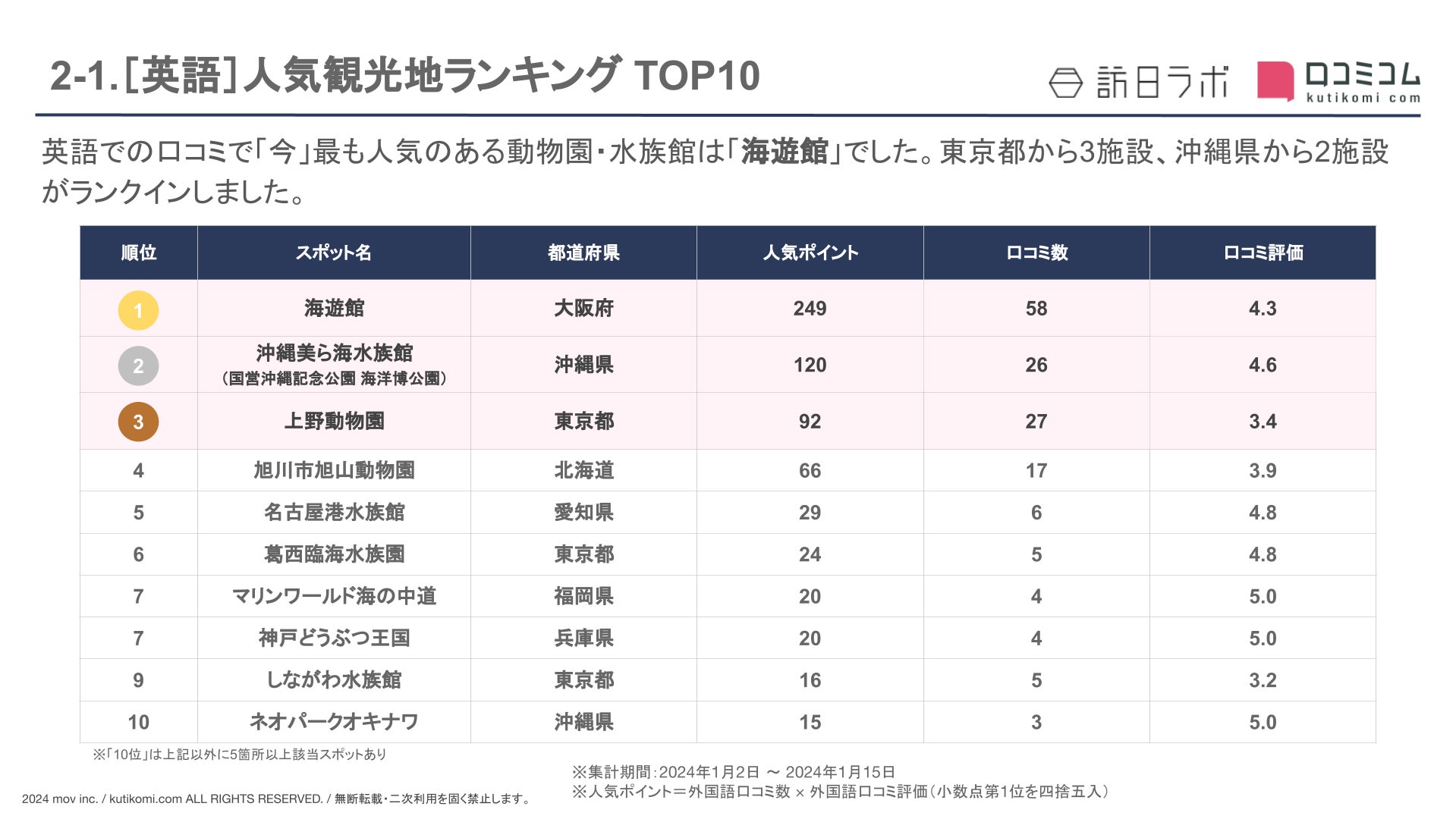 TOP10には海遊館や沖縄美ら海水族館などがランクインしており、特に海遊館が外国人観光客に人気が高いことがわかりました。