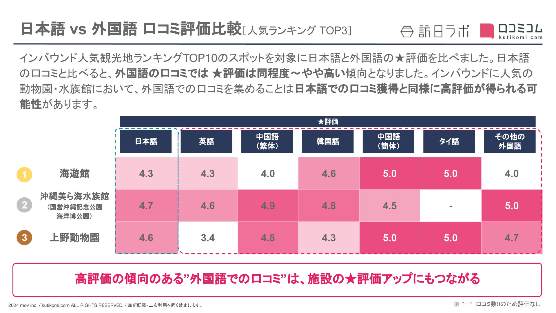さらに、外国語口コミの評価が日本語口コミよりも高い傾向があることも明らかになりました。