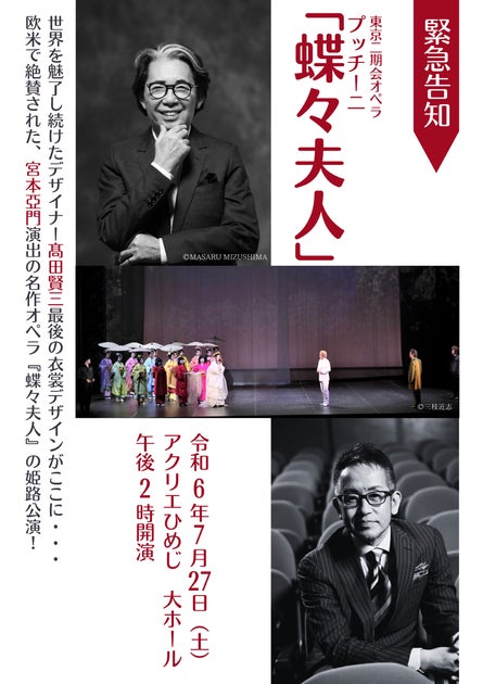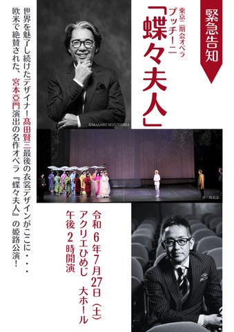 東京二期会が制作し、世界的なデザイナー髙田賢三の衣裳デザインでお届けする名作オペラ「蝶々夫人」の特別公演が、デザイナー髙田賢三の故郷である姫路で開催されます。