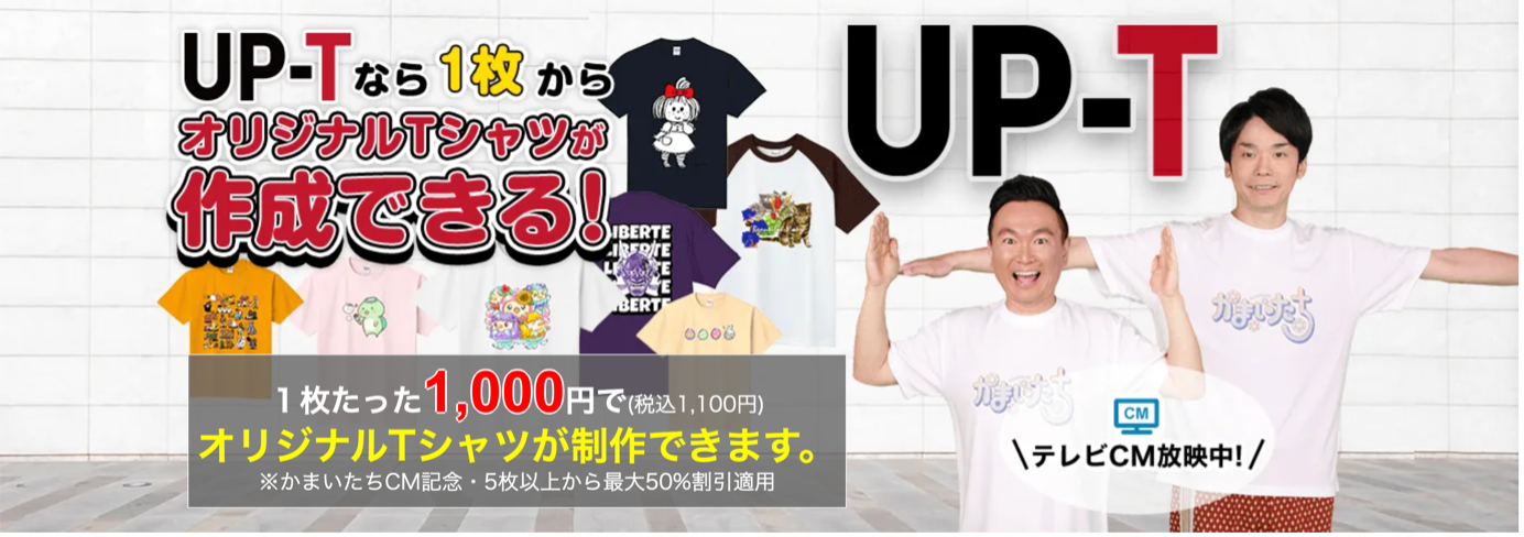 UP-Tはオリジナルグッズ作成のオンデマンドサービスで、Tシャツやスマホケースなど1500種類以上のアイテムを提供しています。